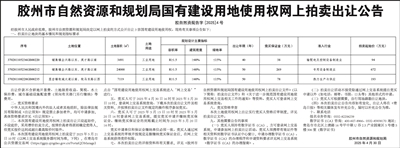 胶州市自然资源和规划局国有建设用地使用权网上拍卖出让公告