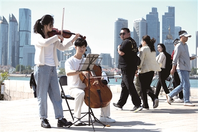 街头演艺近年来发展迅速,新人、新类型不断涌现。5月1日,一组弦乐二重奏出现在奥帆中心,为游人演奏了《一生所爱》《月亮河》等影视金曲。“二重奏”由青岛市歌舞剧院交响乐团大提琴乐手傅豪、青岛城市爱乐乐团小提琴首席张甄组成。“华表奖颁奖活动刚刚在青岛举办,因而,此次街头演艺精选了一批观众耳熟能详的经典电影配乐。”张甄介绍。