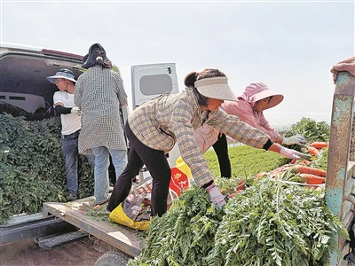大棚内,满头大汗的农民们正忙活着把刚刚采摘的胡萝卜打包装车。