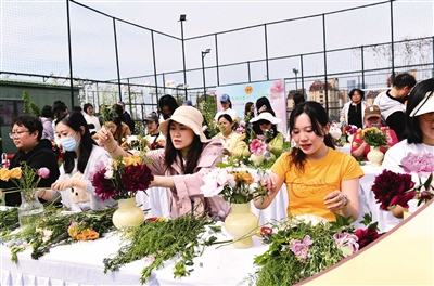“五一”假期前夕,市北区总工会邀请快递员、网约车司机、家政服务人员等来到牡丹园,举办“凝‘新’聚力迎五一·同心筑梦兴乡村”2025年市北区总工会乡村振兴主题活动。眼前是层叠绽放的花海,耳畔是蜜蜂振翅的嗡鸣。有人掏出手机拍下“魏紫”的雍容姿态,有人轻嗅“景玉”的淡雅花香,他们平日奔波在城市街巷的脚步,此刻在花海中得到舒缓。随后,劳动者们参加了牡丹插花比赛,一朵朵华丽的牡丹在瓶中绽放,带来清雅怡人的感觉。