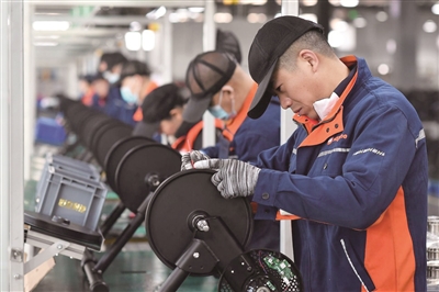 ■青岛迈金智能科技股份有限公司生产车间内,工人在组装智能骑行台。