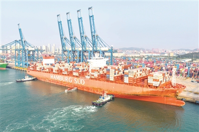 ■在山东港口青岛港自动化码头作业的“凯普圣拉萨罗”轮。