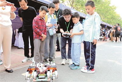 ■在工作人员的指导下小朋友们现场体验控制机器狗。 韩 星 摄