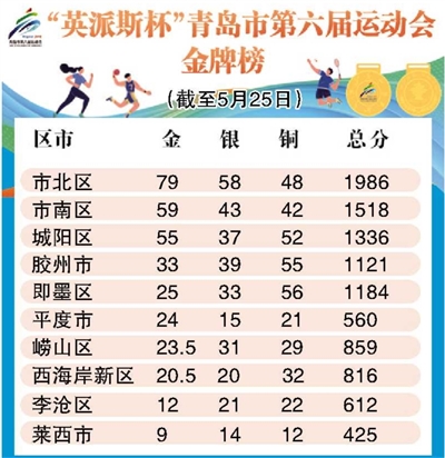 “英派斯杯”青岛市第六届运动会金牌榜