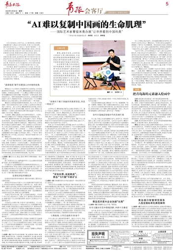 对此,曹俊还分享了近期源于AI技术引发的一场美丽邂逅——近期,美国一博物馆正在筹备关于曹俊和抽象表现主义大师德·库宁的绘画作品对照展。“德·库宁曾说他个人风格的形成是受了中国文化的一些影响,博物馆方面便想找一位在美国活跃着的中国艺术家,看看能不能和他做一个对照,在借助AI进行搜索时,ChatGPT推荐了我。这对我而言是一个重大的展览。”曹俊告诉记者,这一展览将首先在美国展出,随后前往欧洲、来到中国。“也许我会把这个展览带到青岛来。”他说。