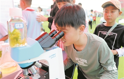 ■在山东大学青岛校区微生物改造技术全国重点实验室,家长和孩子们被科学小实验所吸引。
