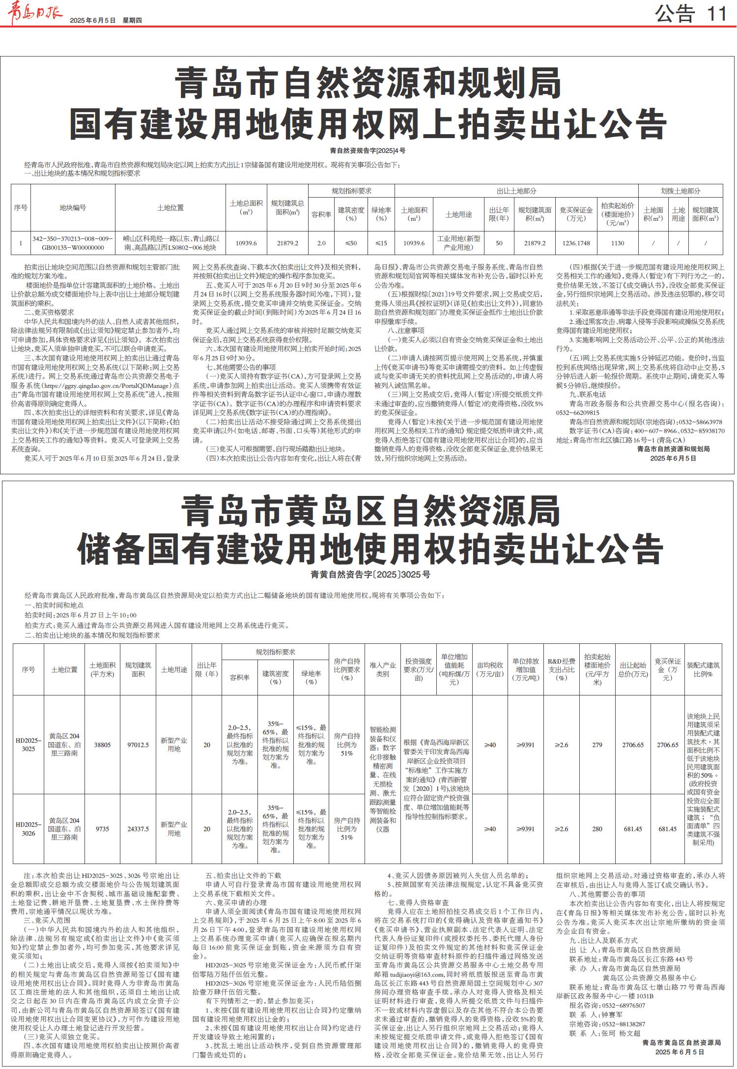 青岛市自然资源和规划局国有建设用地使用权网上拍卖出让公告