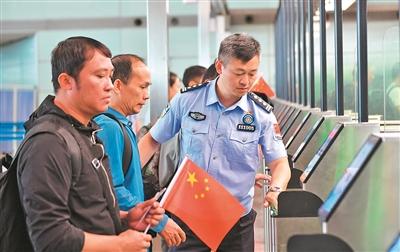 ■6月22日,北京边检总站民警帮助旅客通过快捷通道入境。