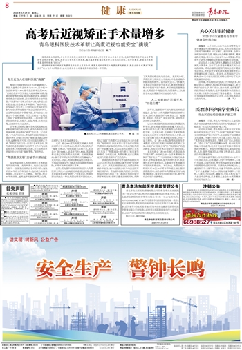 近年来,近视矫正激光手术因其成熟的技术和显著的视力提升效果,成为众多学生告别眼镜束缚、拥抱清晰“视界”的首选。记者获悉,今年高考结束后,青岛眼科医院两院区角膜屈光科门诊每日接诊的“摘镜”患者超过200人次,高峰时每天可为上百人完成近视矫正手术。“两院区均实行周一至周日手术常态化,预约成功的患者,医院可以在两个工作日内为其安排手术,大幅缩短候诊周期,尽可能帮助更多高中毕业生完成‘摘镜’梦想。”龙克利说。