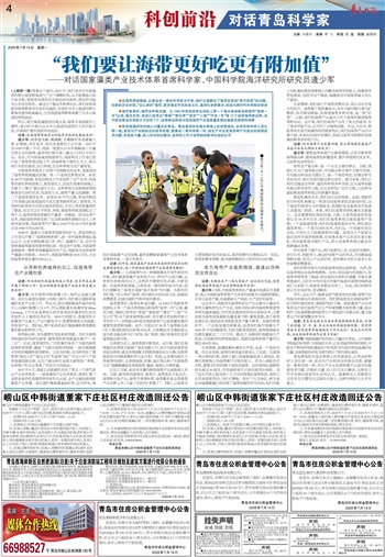 逄少军:一旦将海带作为一种被规模化开发和利用的对象,我们就面临像开发其他产品一样的产业化问题,从育种到养殖再到加工,这些环节需要有机串联,不断创新。在海带养殖领域,以青岛老一辈的科学家为代表,他们主要解决了海带在我国“能不能养”的问题。在新的历史时期,“怎么养好”海带,更好满足市民的多元化、高端化消费需求,则成为新时代科学家的使命。