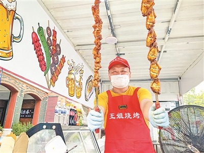■鲍岛食里美食街上,老字号王姐烧烤新创的“大串”颇受欢迎。 笑 言 摄