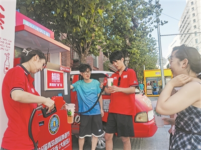 游客在啤酒节老城会场(大鲍岛)啤酒加“油”站体验。