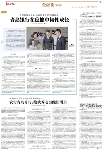 今年以来,青岛银行充分发挥城商行属地化和集团化经营优势,持续构建科技金融、绿色金融和蓝色海洋金融等特色化优势,不仅展现出自身强大的经营韧性和发展潜力,也为行业穿越周期提供了信心及路径。
