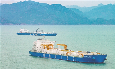 青岛智慧渔业大型养殖工船将海上牧场升级为深远海“移动渔场”。图为“国信1号”和“国信1号2-1”联合开展大黄鱼等名优鱼种养殖。