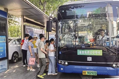 ■暑期免费公交专线吸引市民游客排队体验。 周建亮 摄
