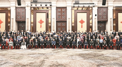 习近平等来到接见现场时,全场响起长时间热烈掌声。习近平向大家挥手致意,不时同代表亲切交流,并同大家合影留念。