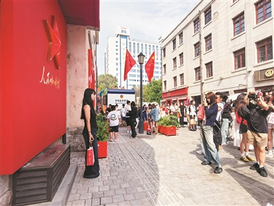 在四方路人民咖啡馆,店铺外墙上的红色五角星成为网红打卡点,吸引众多年轻人在此排队拍照合影。“喜迎国庆,店内在国庆假期首日开展回馈消费者的活动,进店点单送咖啡或冰淇淋等特定产品一份。”店长哪吒介绍。