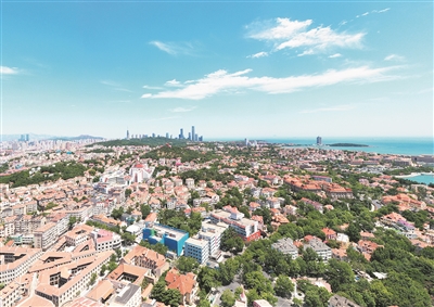 秋日的青岛,蓝天白云与红瓦绿树相互映衬。 刘 栋 摄