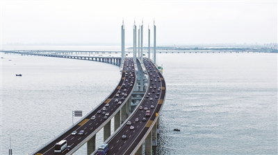 ■图②:10月8日,青岛迎来返程高峰,胶州湾大桥车流绵延成线。