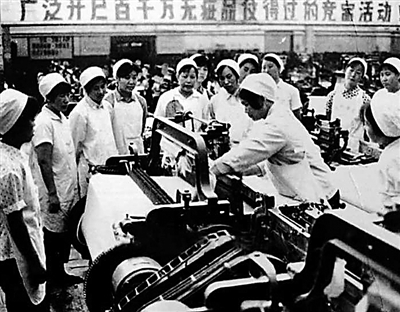 ■1950年“红五月”劳动竞赛中,纺织工人在做示范操作。