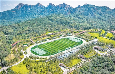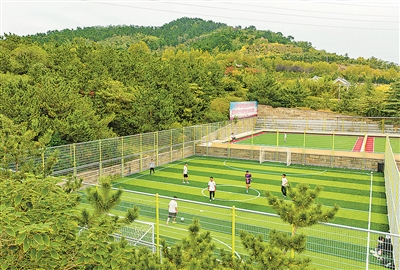 ■山林环抱的浮山全民健身中心足球场。