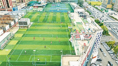■居然之家楼顶的足球场被称为“空中球场”。 杨志文 摄