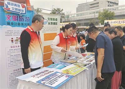 ■市北区在里院美食节现场向市民发放文明旅游、文明餐桌宣传册。 马 艳 摄