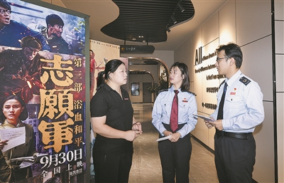 ■观影票房大数据显示,今年国庆档,青岛影迷贡献了近1600万元的票房,有44万人次走进影院,档期内“电影+”联动消费规模更是在票房数据基础上叠加升级。市北区税务部门紧贴文旅相关企业涉税诉求,以“税惠+服务”为国庆档“电影+”消费助力。图为税务干部在一家电影放映企业了解企业经营情况。