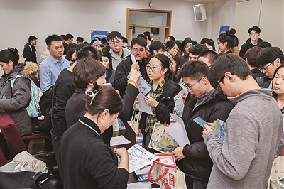 在哈尔滨商业大学现场,气氛热烈,前来投递简历、咨询洽谈的毕业生络绎不绝。