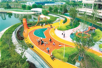 在功能设置上,公园实现“全龄友好”。篮球场满足运动爱好者竞技需求,健身跑道为居民日常锻炼提供便利,休憩驿站可作为市民社交、休闲的临时“落脚点”,儿童娱乐区内的滑梯、攀爬装置、秋千等吸引孩子们就近释放活力。