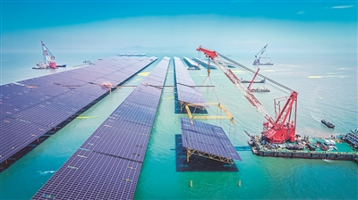 眼下,即墨海上光伏项目海上施工现场一片繁忙,随着吊车“手臂”不停地舞动,一块块光伏板被组装到钢平台上。目前,项目一期首批并网发电,所产生的电能通过电缆输送到陆地,经过升压后进入千家万户。