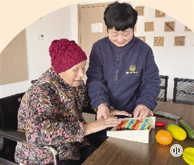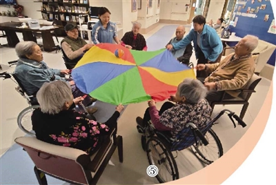 ①平度市同和街道国福社区嵌入式失能失智照护中心工作人员带老年人做康复训练。