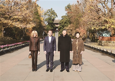 12月5日,国家主席习近平在四川省成都市都江堰同法国总统马克龙进行友好交流。这是习近平和夫人彭丽媛同马克龙夫妇合影。 新华社照片