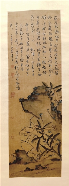 青岛市博物馆这幅高凤翰绢本设色寿石百合图轴纵98.5厘米,横31.2厘米。题跋:窥座新妆侧半倾,脸波乍见一枝横。粉飘葳蕤珠含紫,香破玲珑玉碾清。曲径纡回风细细,小栏低亚月盈盈。不缘老怯深宵坐,搔首酣歌看到明。乾隆丁卯夏五月。西亭百合盛开,对景略为写意,其粉本仍用《芥子园画谱》,方家见之,不笑老伧厚颜犹作依样葫芦耶?老阜六十五岁左手。钤印:二东(朱文引首)、遁卦象(朱文)、凤翰印(白文)、左军司马(白文)、师造物(白文)。