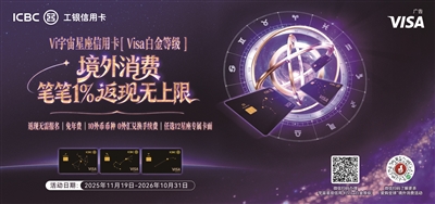 近日,中国工商银行为出境消费客户送上重磅福利——旗下广受年轻客群青睐的Visa宇宙星座白金信用卡,正式新增境外消费笔笔1%无上限返现权益,活动自2025年11月19日起持续至2026年10月31日,覆盖全年出境消费黄金周期,搭配多币种免外汇兑换手续费、免年费、12星座专属卡面等核心优势,为出境游客户与留学生群体带来更贴心、更优惠、更便利的跨境支付体验。
