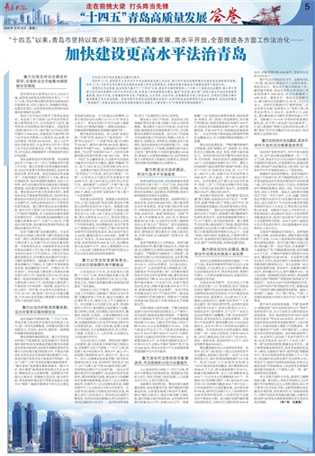 思想伟力无远弗届,法治实践气象万千。“十四五”以来,青岛市全面贯彻党的二十大和二十届历次全会精神,深入学习贯彻习近平法治思想和习近平总书记对山东、对青岛工作的重要指示要求,锚定“走在前、挑大梁”,坚持以高水平法治护航高质量发展、高水平开放,全面推进科学立法、严格执法、公正司法、全民守法,全面推进各方面工作法治化,为现代化国际大都市建设提供了有力法治保障。青岛市获评全国法治政府建设示范市、全国市域社会治理现代化试点合格城市、法治政府建设“典范城市”、首批全国社会治安防控体系建设示范城市,上榜全国十大“年度营商环境创新城市”。