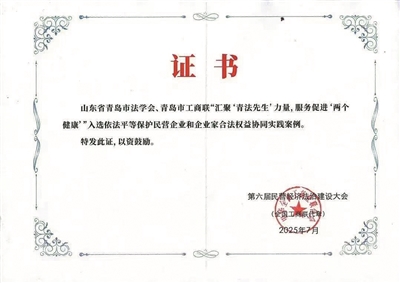 以法之名护航民营企业发展。与政法部门合作,参与建立法律护航民营经济高质量发展协作机制。开展“法律护航”“检察护企”专项行动。“青法先生”案例入选全国工商联协同实践案例。城阳区“法护营商”工作获全国工商联主要负责同志批示肯定。