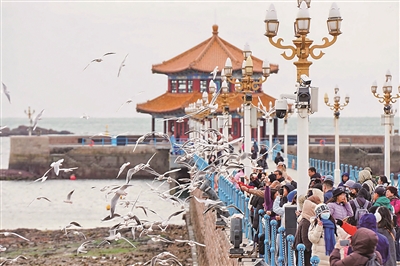 青岛海滨景区上演“人鸥和谐”的美丽画面。