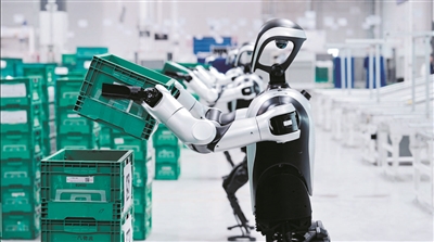 乐聚旗下具身智能机器人在生产线上搬运物料箱。
