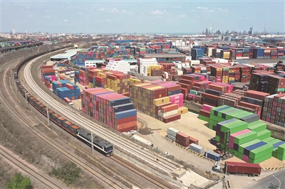 ■一趟装运铝矾土的海铁联运班列经过集装箱堆场。