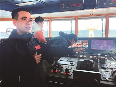 ■在“海上行走的思政课堂”的参观实践环节,“东方红3”船海洋地质专业教师焦强(左一)带学生们参观驾驶室。