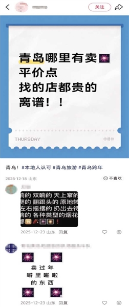记者在小红书平台以“青岛、烟花”为关键词搜索,发现数个求购烟花的帖子。在这些帖子的留言区,部分卖家“潜伏”其中——有的以买家身份提供购买“攻略”,还有的以暗语、图片等方式吸引买家。