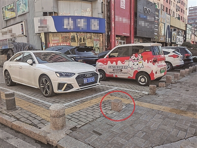 记者近日实地探访发现,绊倒康女士的挡车柱位于郭口路西侧与辽宁路南侧的人行道交会处,是一根高约20厘米的长条形石柱,设置低矮、没有反光涂装,颜色与地砖相近。现场还有圆头圆柱、平头圆柱、平头四方锥等其他样式的挡车柱。这些各式各样的挡车柱穿插设置,高度从15厘米至45厘米不等,间距从40厘米至150厘米不等,且仅少数有反光标识。