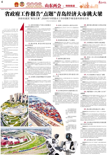 今年的省政府工作报告,既回顾了山东过去一年及“十四五”时期的工作成绩,也为“十五五”和2026年的发展描绘出清晰的“路线图”。透过省政府工作报告,既能看到青岛全力以赴稳增长、经济大市挑大梁的坚实身影,也能看到山东加快推进现代化强省建设对青岛“强龙头”的深切期待。报告有30多处直接提到了青岛的工作或项目,体现了省委、省政府对青岛发展的关心和重视。