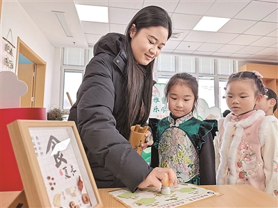 在青岛太平路小学,学生们身着喜庆服饰,化身“非遗”小传人,在非物质文化遗产代表性传承人及老师们的指导下有序闯关。“妙剪窗花”环节,学生们发挥想象,自主设计窗花图案,并围绕作品趣味讲解,让动手实践与想象力、表达力有机结合。在脸谱与泥塑主题的体验中,学生们联动英文表达与演唱技能,让传统文化与艺术表现碰撞出别样火花。学生们在参与投壶、绒花、扇子等非物质文化遗产代表性项目体验过程中,既要完成肢体协调的实践任务,又要判断距离、数量等相关问题。动思结合中,学生们逻辑思维与动手实践能力得到提升。