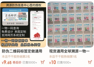 记者以“防伪标签定制”“防伪系统开发”为关键词在多个电商平台及搜索引擎检索,可轻易找到大量提供此类服务的商家。一家年订单量超7000件的防伪标识定制商家介绍,现货通用“全球溯源”防伪二维码40元1000个,单价低至4分钱一个。记者扫描该商家提供的二维码样本后,进入“防伪网信息验证中心”,该网页的备案主体也是一家被列入经营异常名录的公司。
