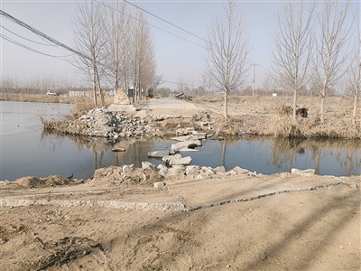记者在现场看到,李家场村与新庄疃村之间建有一条双向两车道水泥路,道路经过潴拱河处原本是一座漫水桥,桥体已完全垮塌,多块不规则的大石块垫在河底。记者小心翼翼地踩着这些石块过河,感觉极难保持平衡,稍有不慎就可能落入水中。
