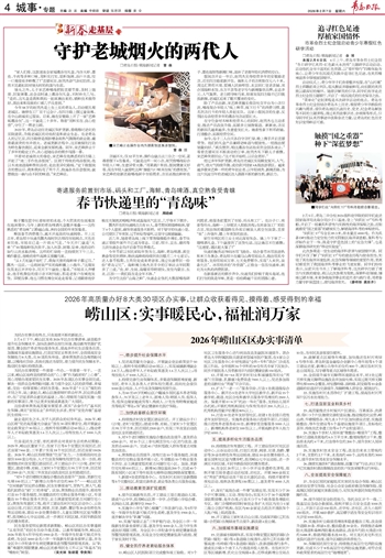 2月6日下午,崂山区发布2026年区办实事清单,涵盖稳步提升社会保障水平、加快改善群众居住环境、推动教育资源扩优提质、健全医疗养老育幼服务体系、提高多样化生活服务品质、加强城市基础设施建设、打造宜居宜业和美乡村、全面提高安全保障能力8大类,共30项具体举措。清单聚焦群众急难愁盼问题,以精准化供给、系统化推进为原则,着力提升民生保障水平,推动民生福祉持续改善。