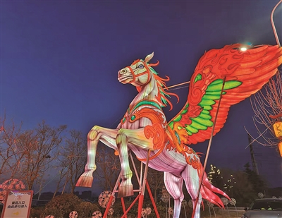 传统祥瑞元素与非遗彩灯技艺的融合,是这场山海灯会的特色看点。天马流光、山海画卷、星缕花径……灯会将国风四季与街区的中式门楼融于一体,在传统纹样中注入现代设计语言,营造出既典雅又灵动的东方美学场景,漫步其间,仿佛走入一幅流动的国风长卷。尤其是2.5米高的炫彩天马,是整个灯会的核心打卡区域。12米高的四大神兽灯组,造型威严灵动,尽显上古神话的瑰丽,仿佛步入东方奇境。