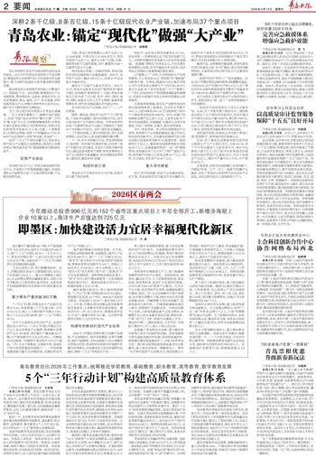 新的一年,全市教育系统将统筹推进教育强市建设规划纲要和学前教育、基础教育、职业教育、高等教育、数字教育5个三年行动计划,出台《青岛市“十五五”教育事业发展规划》。